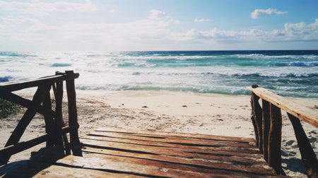 Sandy Path to Ocean Paradise Tranquil Beach Scene with Wooden Boardwalk and Azure Waters