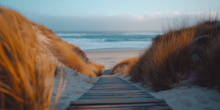 Golden Hour Serenity Wooden Path Winds Through Beach Dunes to Ocean Waves and Dramatic Clouds