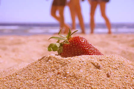 A ripe red strawberry on the wet yellow sand. The strawberry lies on the beach, washed by the wave. Selective focus.