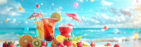 Colorful cocktails with fruit garnishes and umbrellas sit on a beach with a blue ocean and sky in the background.