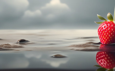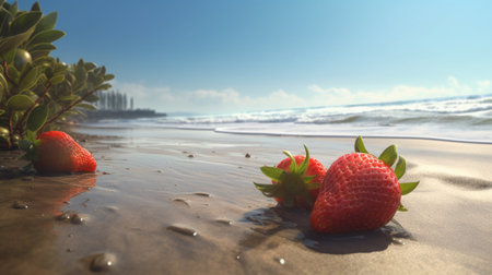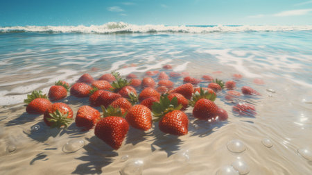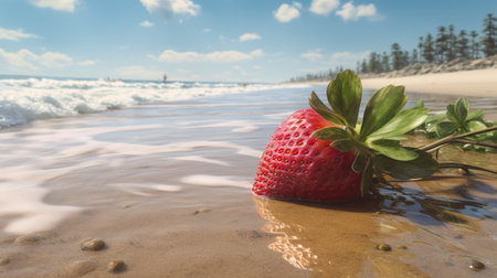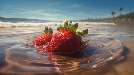a vibrant and high-energy photo captured on flickr, showcasing a strawberry immersed in water with sand along the beach. the image is beautifully solarized, reflecting the artistic style of a master photographer. with elements of felinecore and soft gradients, this realistic yet romantic composition is sure to captivate viewers. don't miss out on the mesmerizing effects of rtx on!, ai generated