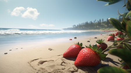 Strawberries on the sandy beach with the sea in the background