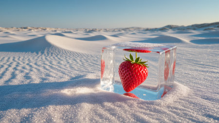 A clear block of ice encases vibrant strawberries in a vast snowy desert.