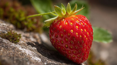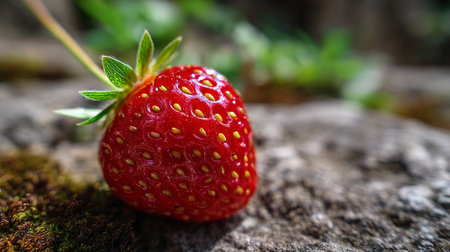 A ripe red strawberry sitting on a rocky surface in a natural setting