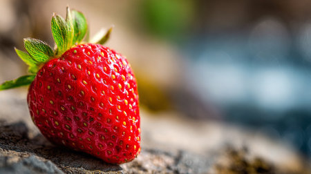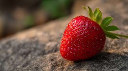 A ripe red strawberry with green leaves on a natural stone surface outdoors