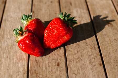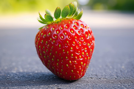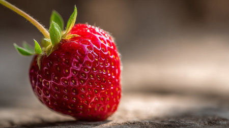 Single ripe strawberry resting in natural sunlight on a table