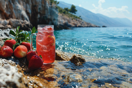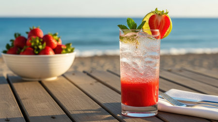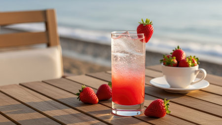 A glass of strawberries cold refreshing drink on sea background at sunny summer day, neural network generated image