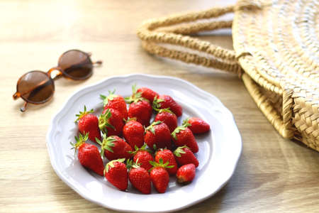 Lilac plate full of fresh strawberries, straw bag and retro sunglasses on wooden table. Selective focus.