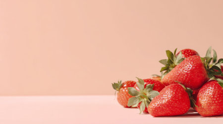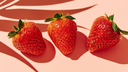 Experience the freshness of red strawberries resting on a soft pink background. The light creates dramatic shadows, emphasizing their texture and natural appeal.