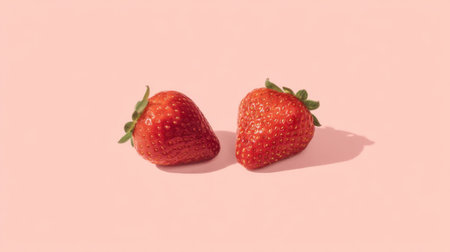 This image features two fresh strawberries on a soft pink background, highlighting the vibrant colors and textures, ideal for food-related projects and dietary themes.