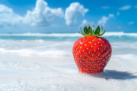 Strawberry on the beach with ocean and blue sky background.