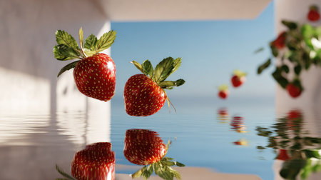 This captivating image features fresh, juicy strawberries gently floating over calm water, reflecting their vibrant colors against a serene blue sky.