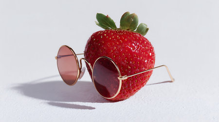Strawberry with sunglasses on white background. Selective focus.