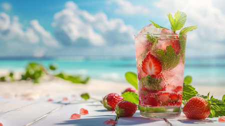Refreshing summer drink with strawberries and mint on the beach.