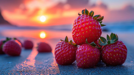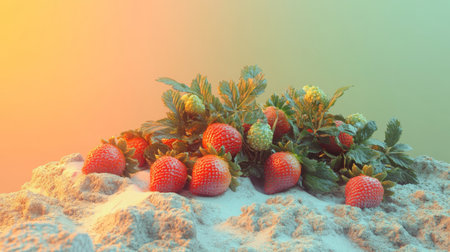 A vibrant display of fresh strawberries nestled on a sandy surface, bathed in soft light. The scene captures the essence of nature's bounty and summer harvest.