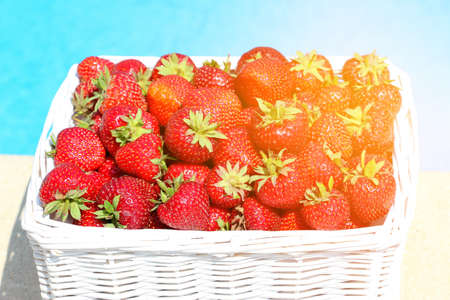 Ripe fresh strawberries in a wicker white basket after collecting sweet red berries on a background of blue water.