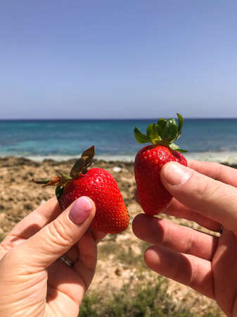 ripe strawberries in the hands of a couple on a background of blue sky and sea. Protaras. Ayia Napa. Cyprus