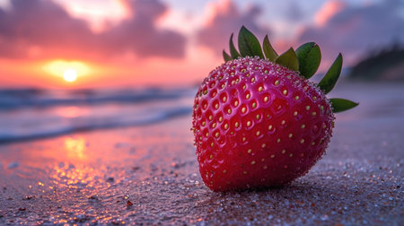 Strawberry on the beach at sunset. Summer vacation concept.