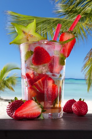 Strawberry mojito cocktail on the beach in summer.