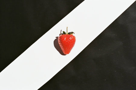 Fresh red strawberry on a contrasting black and white background, highlighting vibrant colors and a minimalist design
