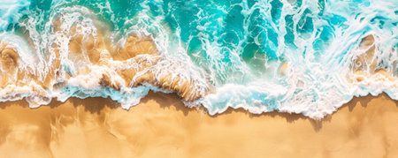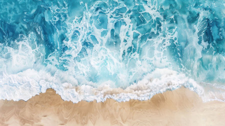 Ocean waves crashing on sandy beach, turquoise waters with foamy white surf, serene coastal scene, perfect for relaxation and nature themes, bright and refreshing atmosphere