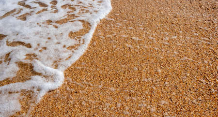 Golden brown sand on a beach with white foam on wave of pastel green color sea water, close up image