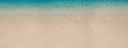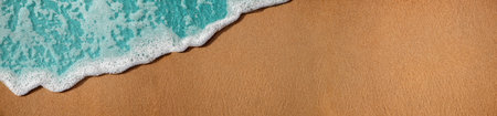 Empty Sand Beach and Soft Blue Wave on Summer Sunny Day. Natural Texture Background. Wide and Long Size for Copy Space. Top View. Focus on Sand