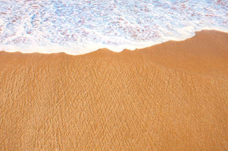 Soft wave of blue ocean on sandy beach. Background. Empty beach with sea foam washing up from sea.