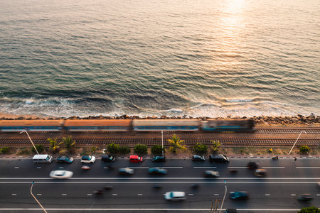 Road and railway track along coast at sunset over Indian ocean. Train arriving in Colombo, Sri Lanka.