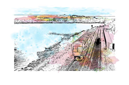 Building view with landmark of Derry is a city in Northern Ireland. Watercolour splash with hand drawn sketch illustration in vector.