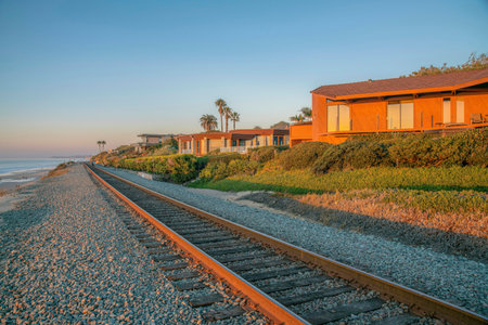 Railroad and beach houses on a cliff at Del Mar Southern California at sunset. Seaside homes and railway on with a peaceful view of sandy shore, sea, blue sky, and horizon.