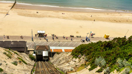 Bournemouth, UK 07-20-2010: Vintage funicular railway that has an ascending and descending wagons that operate on the cliffs and links the town with the coastal attractions including promenade and beach.
