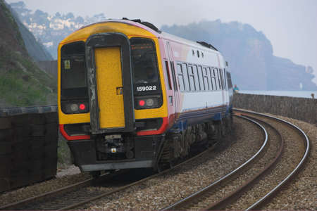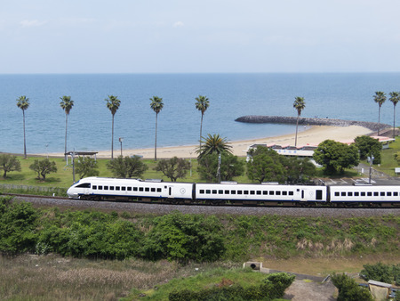 Electric train running on a coastal line