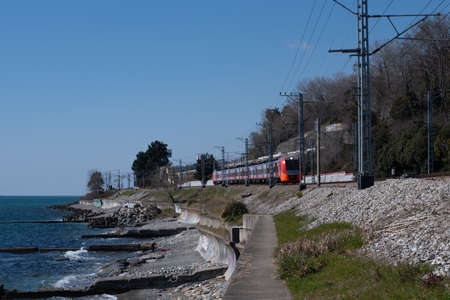 Russian Lastochka train goes along the coast