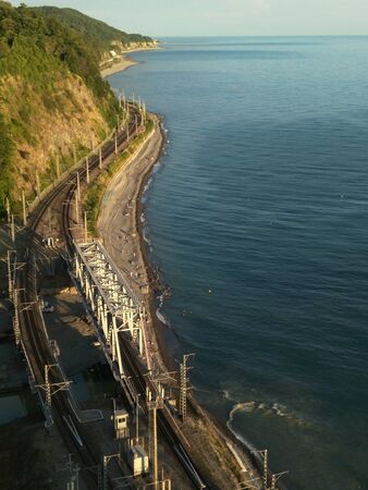 landscape the Black sea and the railway along the Caucasus mountains. Top view.