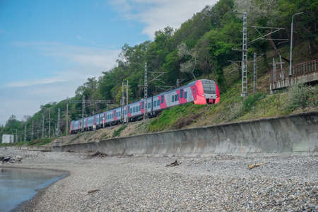 Passenger double deck train moves along the Black sea beach. Sochi. Russia.