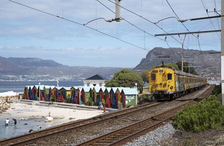 Train passing by St James Beach with colorful bathing boxes, Cape Town, South Africa