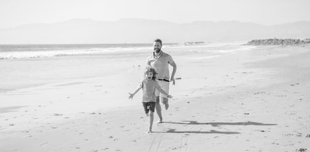 father and son running on summer beach. family travel weekend and vacation.
