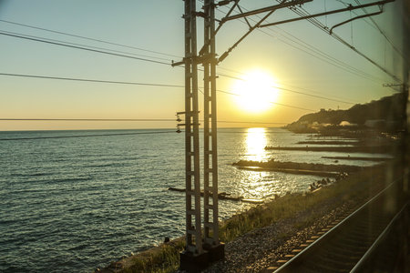 Railway station on the background of the sea at sunset. Sochi, Russia