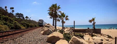 San Clemente, CA, USA – July 31, 2017: Train moves along tracks that run through San Clemente State Beach in Southern California in summer. Editorial use.