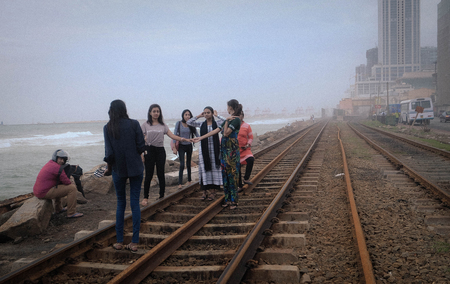 Colombo, Sri Lanka - August 10, 2019: The Unspecific girls are playing together at the Scenic Train Ride Along the Coast to Colombo in Sri Lanka. And have many building is constructurtre at the Colombo city.