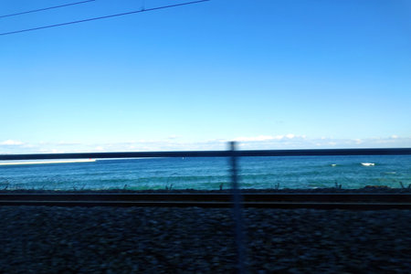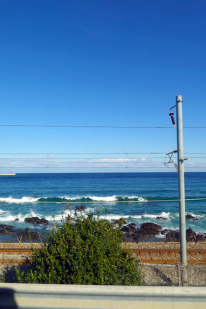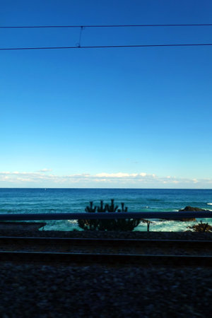 Beautiful view of the sea from the train. Blue sky background.