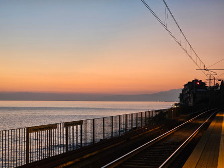Evening view of Chiwata Station, Nagasaki, Japan, which is located right by the sea and has a great view.