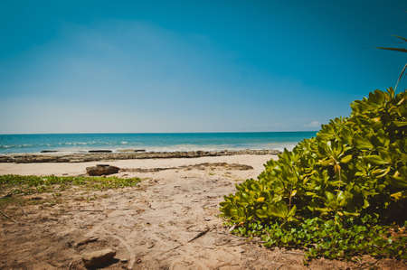 Closeup of tropical bushes at white sand beach and turquoise sea water