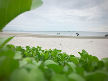 Fishing boats and couple in love on beachfront. Green plants on the beach as foreground. Blue sky with cloud as background. Beach view of Thailand.