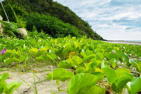 Ipomoea pes-caprae commonly known as bay hops is a creeping plant on the beach, acts as a sand stabilizer. it is a salt-tolerant plant. Galle beach evening low angle view.