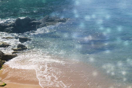 Top view of sand and sea water splash with copy space at tropical clean summer beach.