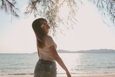 Cheerful Asian woman enjoy the breeze and walking on the beach in Thailand