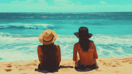 Two women in hats sit on a sandy beach facing the ocean under a clear sky. Waves gently crash on the shore.
