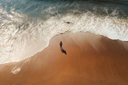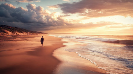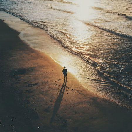 A solitary figure stands on a sandy beach as the sun sets, casting a long shadow. The tranquil ocean waves gently caress the shore.